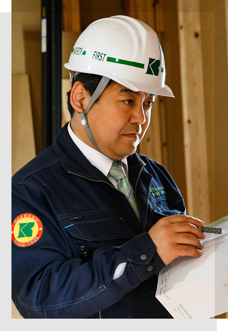 木造住宅を中心とした現場の施工管理をしています。原価管理・品質管理・工程管理・安全管理などの業務のほか、営業部から新規案件の相談があれば、現地調査した上で技術・施工面からの提案も行います。